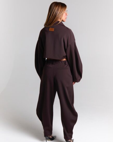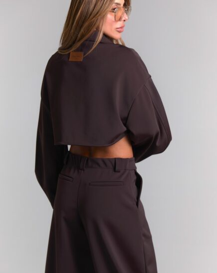 ג'קט קרופ מחויט בגזרה נקייה עם צווארון מובנה סגירה קדמית מדגיש את הקו המותן מגיע במידות S M L על הדוגמנית מידה S