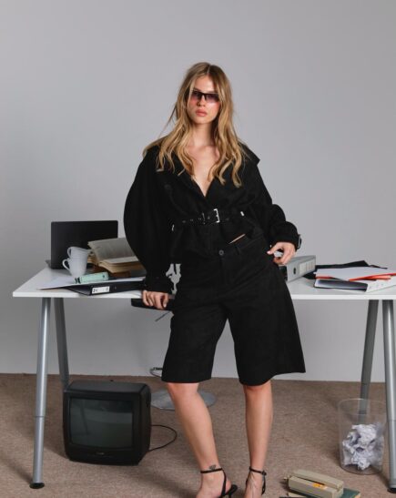 מכנסי ברמודה RYAN בגזרה רחבה מבד זמש מגיע במידות S M L על הדוגמנית מידה S