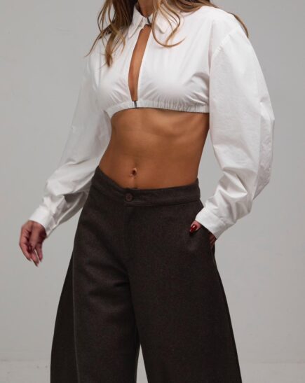 חולצת קיילי מכופתרת קרופ בגזרה חדה עם צווארון קולר וסגירה קדמית מגיע במידות S M L על הדוגמנית מידה S