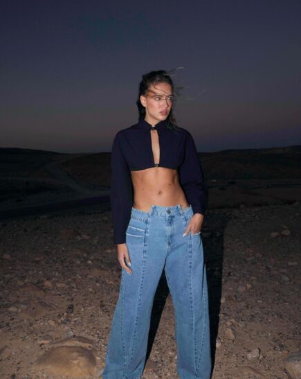 חולצת קיילי מכופתרת קרופ בגזרה חדה עם צווארון קולר וסגירה קדמית מגיע במידות S M L על הדוגמנית מידה S