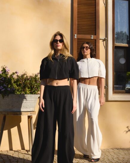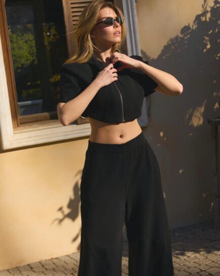 חליפת לורי 2 חלקים ג'קט קצר בגזרת קרופ ומכנסיים בגזרת בלון מגיע במידות S M L על הדוגמנית מידה S
