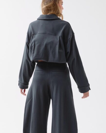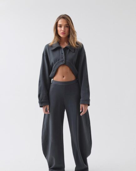 החליפה כוללת ג׳קט קצר בגזרה רחבה ומכנסיים ישרים עם מפתח רגל מרווח שיושבים מושלם על הגוף.