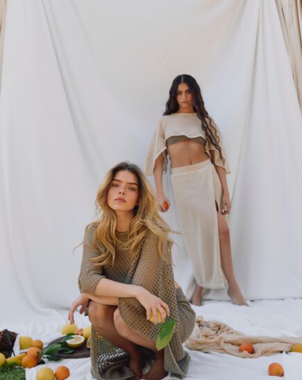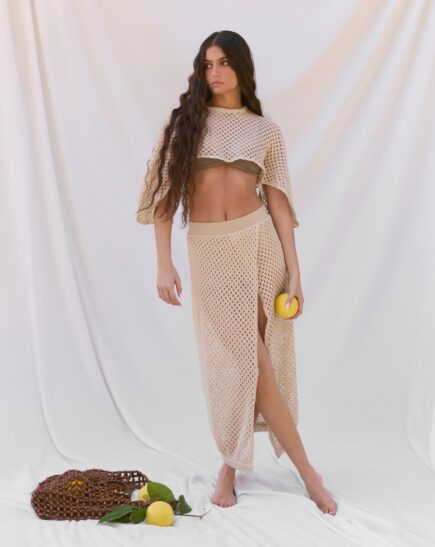 חצאית מקסי סרוגה בגזרה מחמיאה עם שסע קדמי מגיע במידות S M על הדוגמנית מידה S