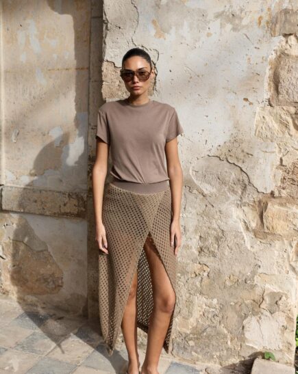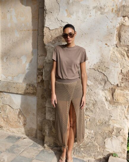 חצאית מקסי סרוגה בגזרה מחמיאה עם שסע קדמי מגיע במידות S M על הדוגמנית מידה S