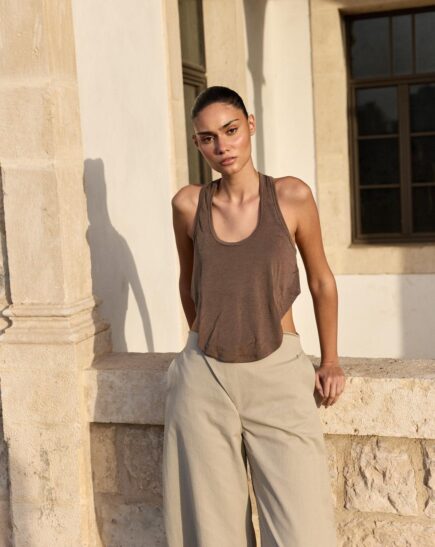 גופיית ריילי עם מחשוף עמוק עם נפילה טיבעית על הגוף במידות S M L הדוגמנית לובשת מידה S