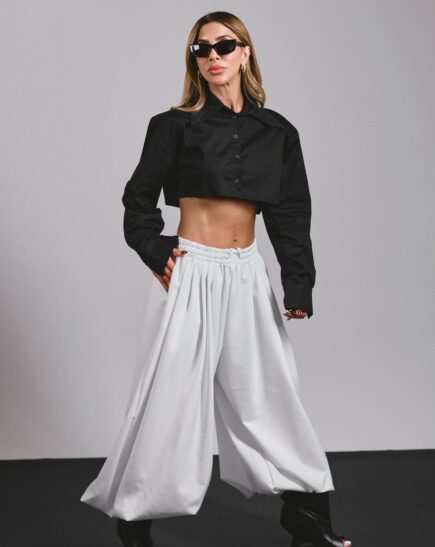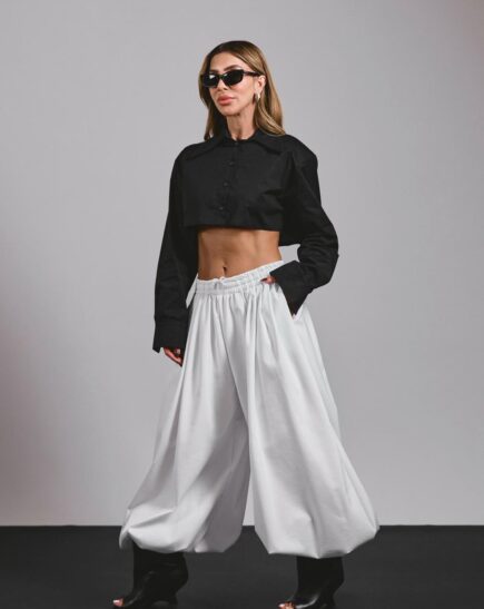 מכנס ברוקלין בגזרת בלון במראה באגי עם פנסים קדמיים עם מותן גבוהה המאפשרים התאמה מושלמת לגוף מגיע במידות S M L על הדוגמנית מידה S מתאים לשילוב עם ג'קט ברוקלין