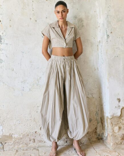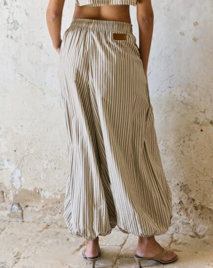 מכנס קמיל בגזרת בלון עם קפלים קדימה גומי במותן נוח ומחמיא על הגוף במידות S M L הדוגמנית לובשת מידה S