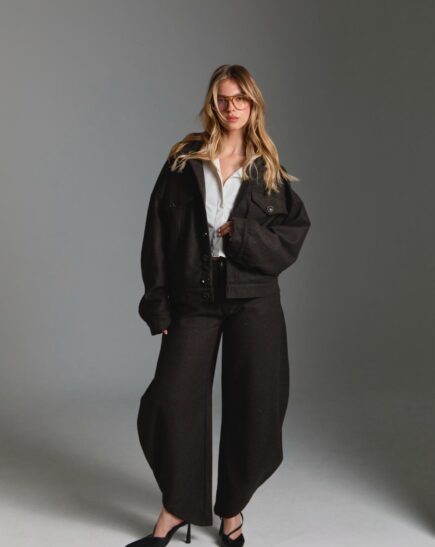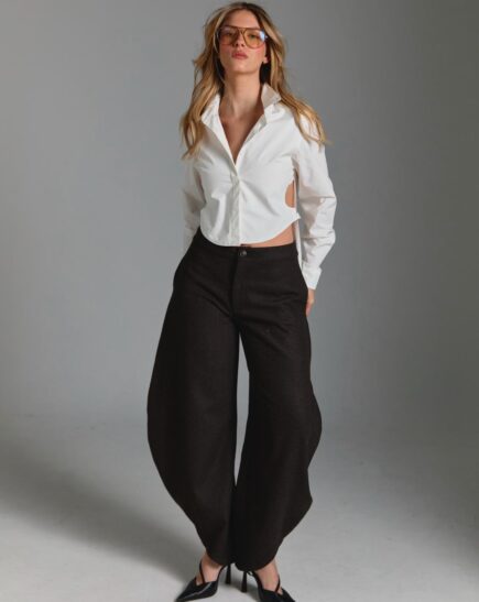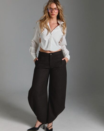 מכנס ELLIOT בגזרת בלון רחבה וארוכה עם סגירת כפתור ורוכסן מגיע במידות S M L על הדוגמנית מידה S
