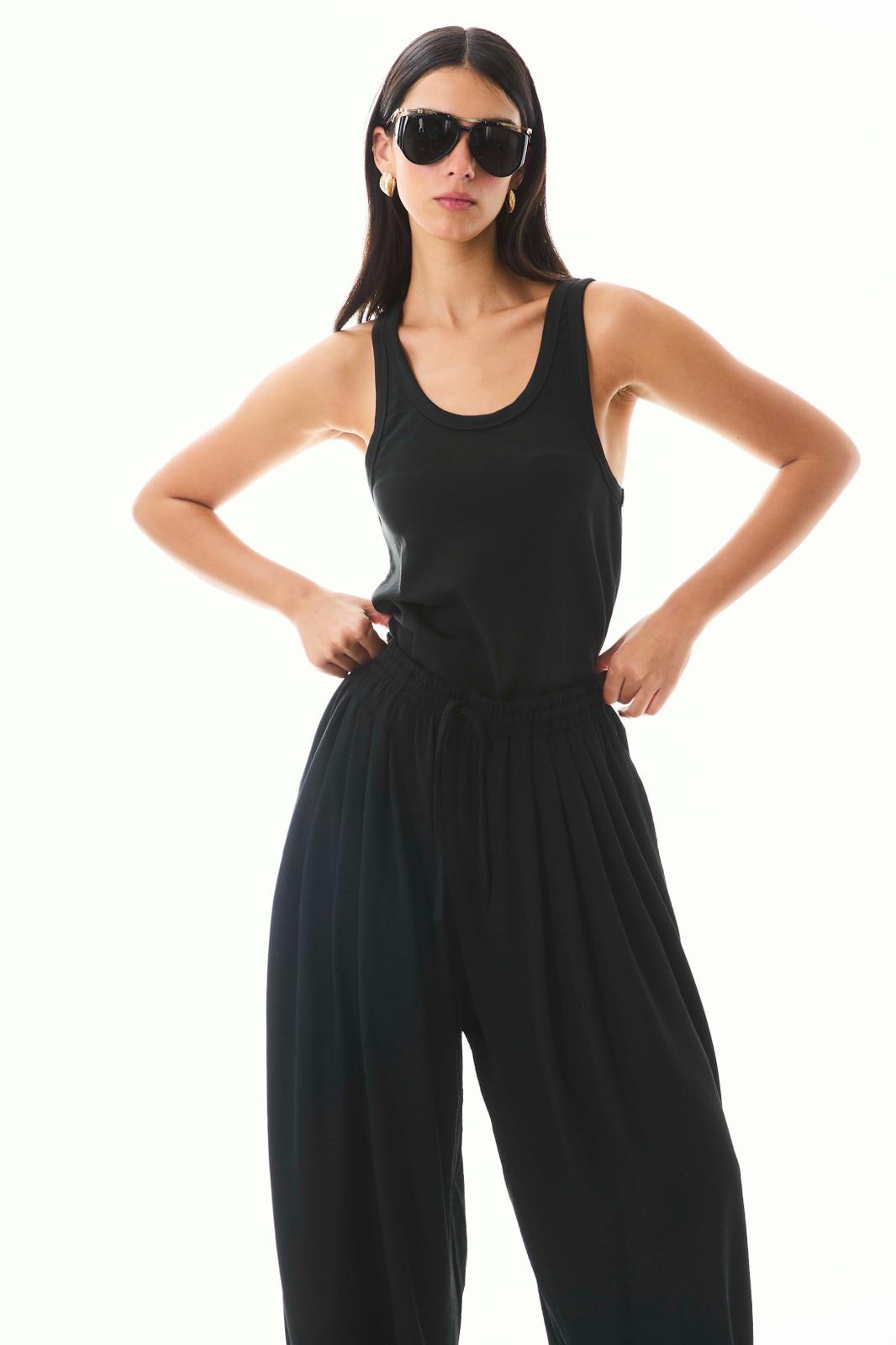 מכנס מרלו בגזרה משוחררת עם משבצות מגיע במידות S M L על הדוגמנית מידה S