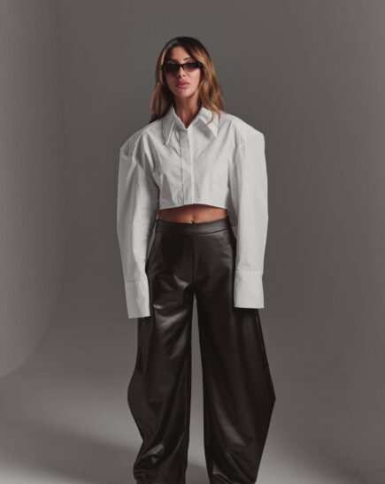 מכנס מייבן מבד דמוי עור בגזרה גבוהה ומחטבת מגיע במידות S M L על הדוגמנית מידה S