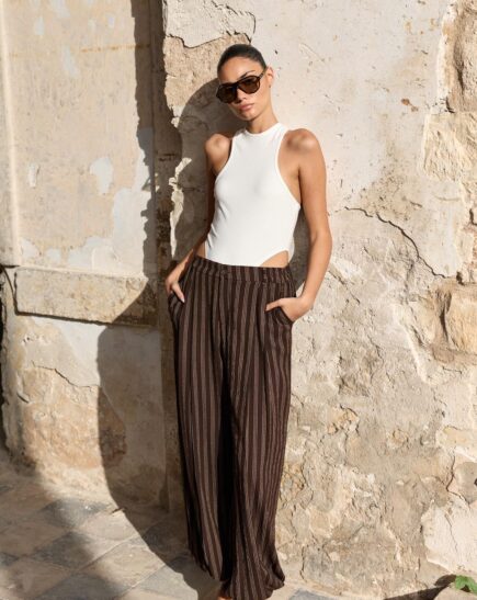 מכנס רחב בגזרה נשפכת עם פסים דקים מותן גבוהה וכיסים צדדים במידות S M L הדוגמנית לובשת מידה S