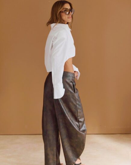 מכנס RAVE דמוי עור בגזרת בלון מבד דמוי עור עם נפילה רכה מראה מחויט וקלאסי מגיע במידות S M L על הדוגמנית מידה S