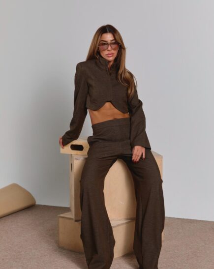 מכנס שון בגזרה רחבה עשוי מבד מחויט נשפך יושב גבוהה על המותן מגיע במידות S M L על הדוגמנית מידה S