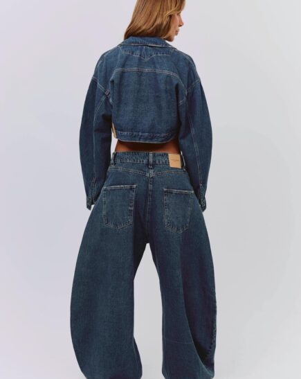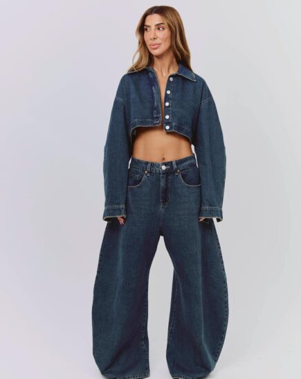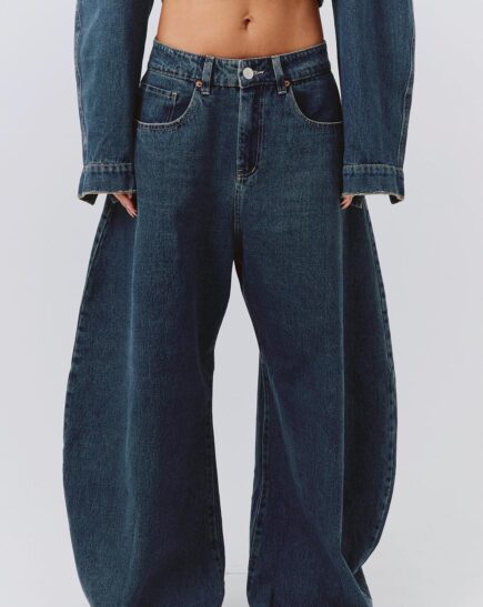 ג'ינס בגזרת בלון מותן גבוהה למראה אופנתי קליל ונוח מגיע במידות 34-40 על הדוגמנית מידה 36